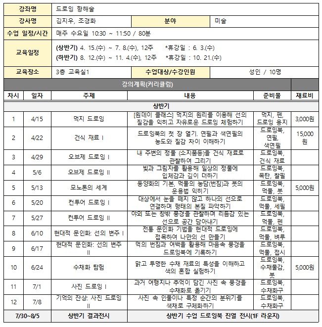 ○ 안내사항 - 본 프로그램 커리큘럼은 상반기와 하반기가 동일합니다. - 본 수업은 1회차당 선택 수업도 가능합니다.(1회당 5,000원) - 재료비는 강사에게 별도 납부해야 합니다.
