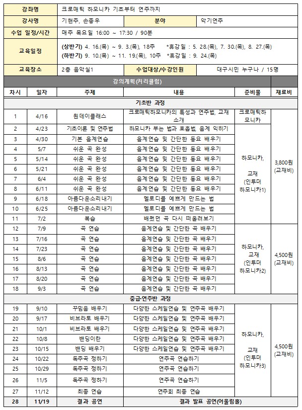 ○ 신청방법 - 해당 교육은 대구생활문화센터 홈페이지 회원가입 후 신청 가능합니다. - 여름 휴강 기간(여름방학)으로 인해 프로그램 신청은 상반기/하반기로 나누어 진행됩니다. (*하반기 프로그램 신청은 8월 10일부터 신청 가능)