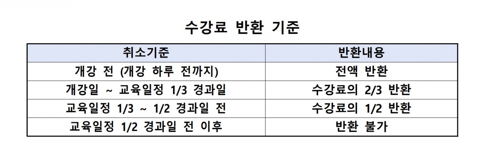 *교육 신청 취소가 아닌 단순 불참은 수강료 반환 대상이 아닙니다.