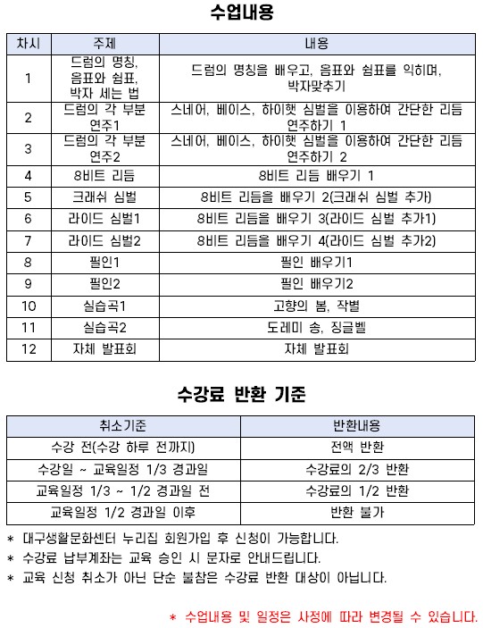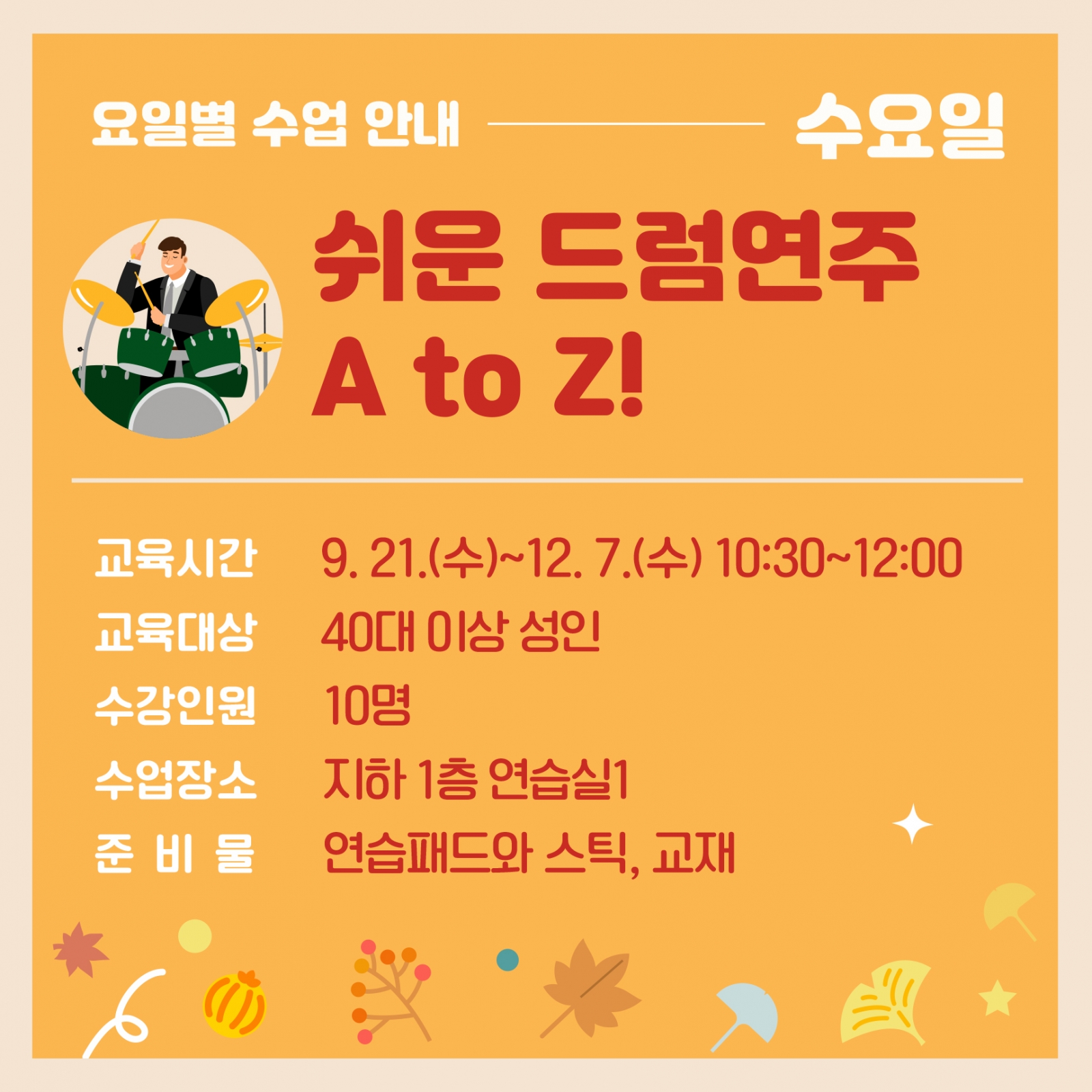 9. 21.(수) / 9. 28.(수) / 10. 5.(수) / 10. 12.(수) / 10. 19.(수) / 10. 26.(수) / 11. 2.(수) / 11. 9.(수) / 11. 16.(수) / 11. 23.(수) / 11. 30.(수) / 12. 7.(수) 총 12주 수업 프로그램입니다.