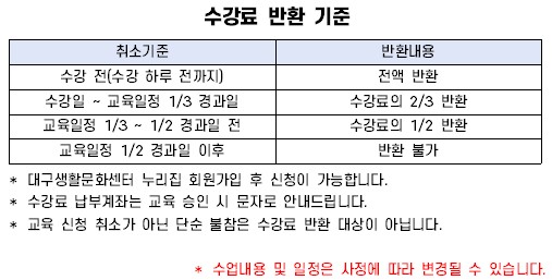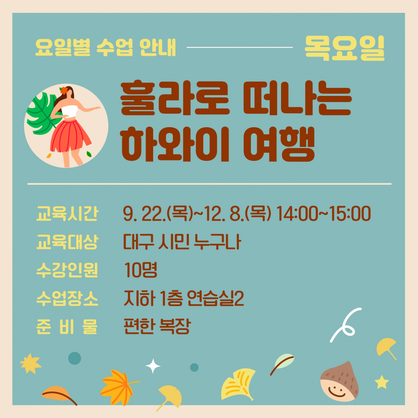 9. 22.(목) / 9. 29.(목) / 10. 6.(목) / 10. 13.(목) / 10. 20.(목) / 10. 27.(목) / 11. 3.(목) / 11. 10.(목) / 11. 17.(목) / 11. 24.(목) / 12. 1.(목) / 12. 8.(목) 총 12주 수업 프로그램입니다.