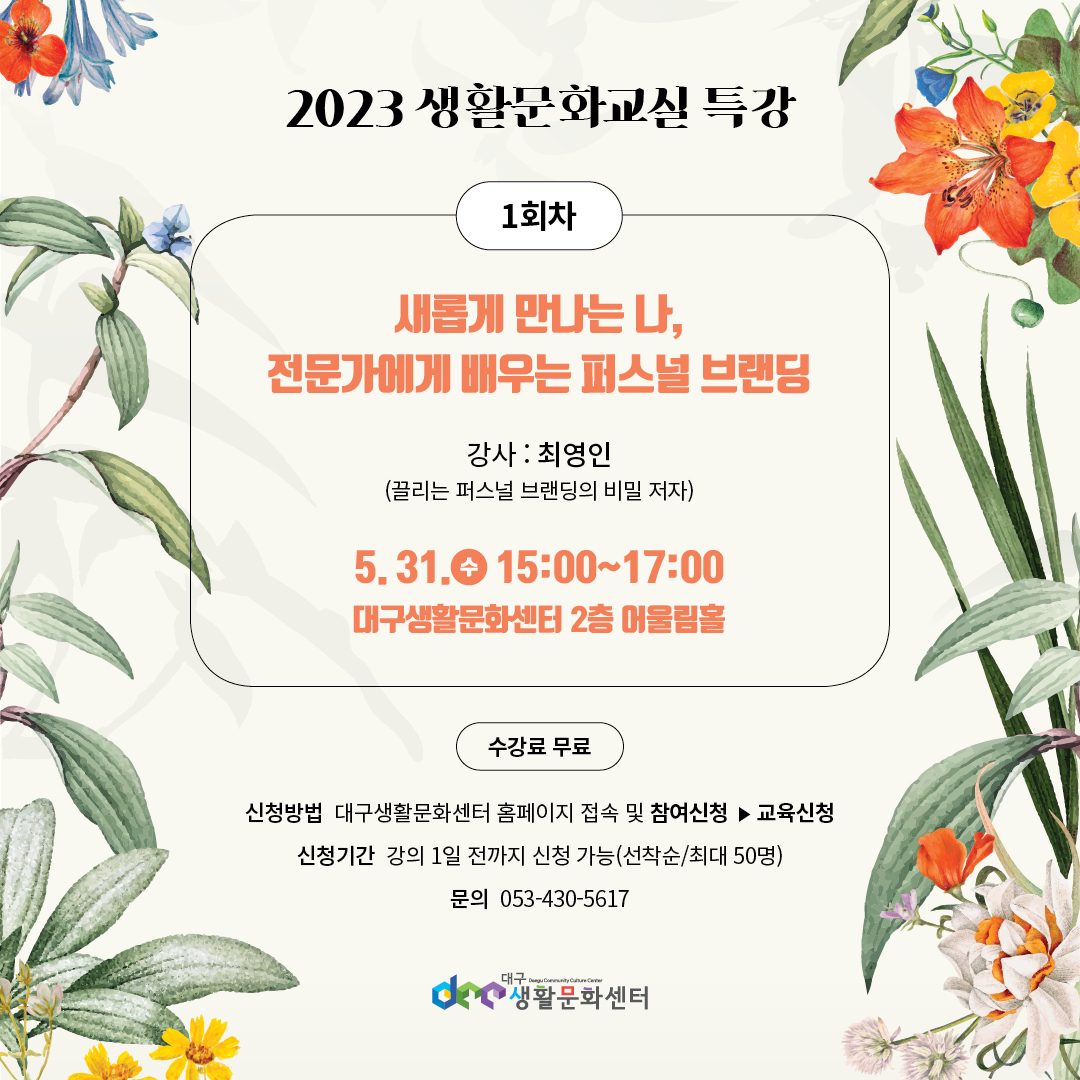 생활문화교실 인문학 특강 1회차 내용입니다. 강의는 무료로 진행되며 선착순으로 모집합니다. (5.5일 10시 오픈)
