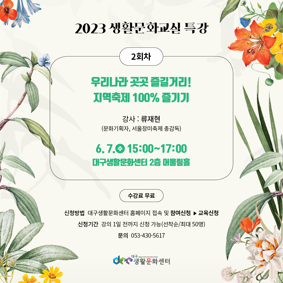 생활문화교실 인문학 특강 2회차 내용입니다. 강의는 무료로 진행되며 선착순으로 모집합니다. (5.5일 10시 오픈)