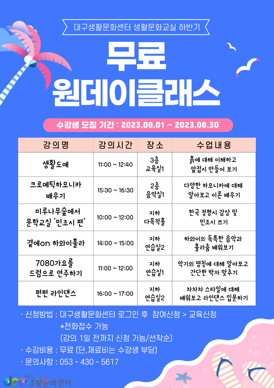 생활문화교실 무료수강 이벤트로 하루만 진행하는 수업입니다.