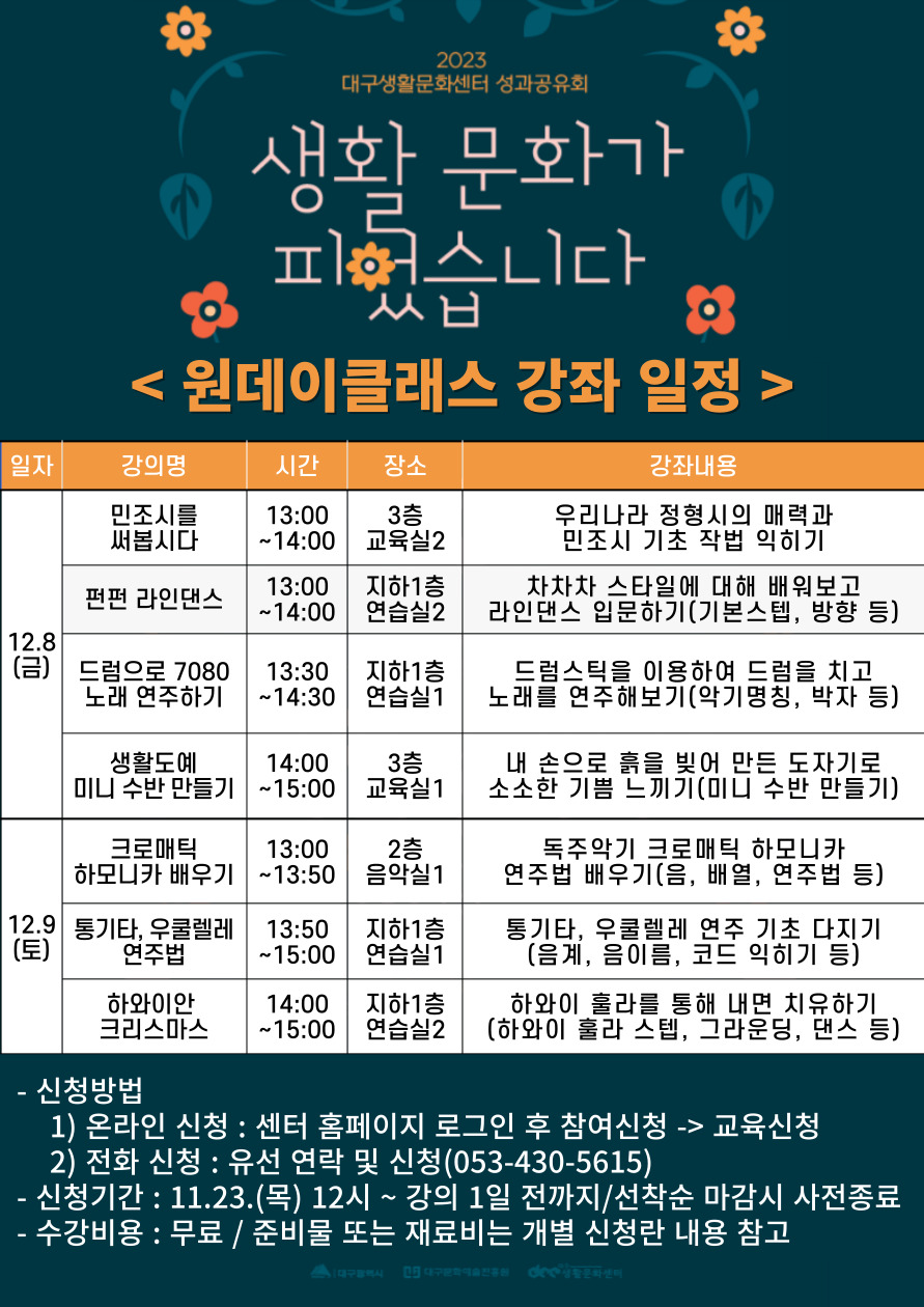 대구생활문화센터 성과공유회 연계 생활문화교실 원데이클래스 무료수강 강좌로 하루만 진행하는 수업입니다.