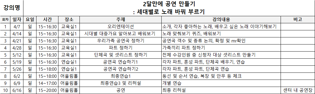 총 10회차/준비물: 노래교재 별도 구입(5,000원 정도)/ 휴강기간: 5월 5일(어린이날)
