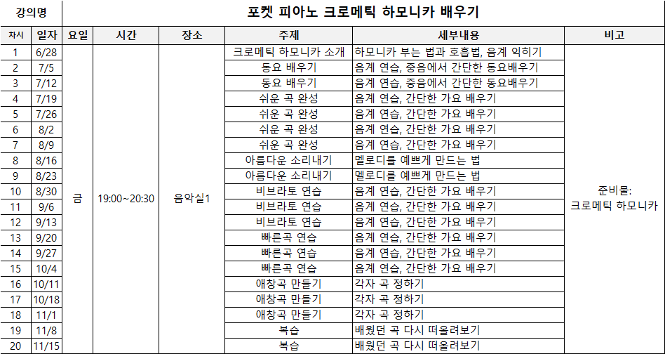 총 20회차 / 준비물: 크로메틱 하모니카 / 휴강일 : 10월 25일