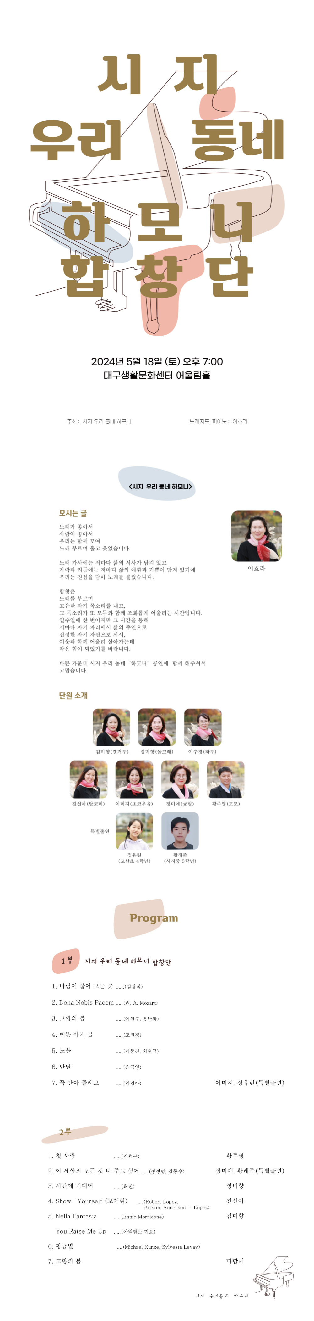 **꼬메스 콰이어(Comes Choir)**는 합창에 진심인 단원들이 모여 아름다운 하모니를 만들어가는 합창단입니다.